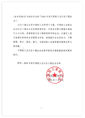2025年7月9日,中國(guó)輕工業(yè)聯(lián)合會(huì)發(fā)布《中國(guó)輕工業(yè)行業(yè)十強(qiáng)企業(yè)統(tǒng)計(jì)評(píng)價(jià)結(jié)果公告》(中輕聯(lián)信統(tǒng)(2025)136號(hào)),發(fā)布了我國(guó)輕工業(yè)各行業(yè)的“2024年度中國(guó)輕工業(yè)行業(yè)十強(qiáng)企業(yè)”名單。